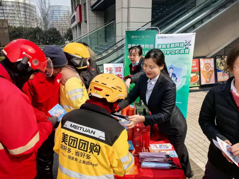 为切实维护外卖骑手等新就业劳动者的合法权益,营造安全、诚信、规范的金融消费环境,3月10日,中国人寿财险郑州市中心支公司联合广发银行龙子湖支行,走进外卖骑手群体,开展“清朗金融网络 守护安心消费”主题“3・15 国际消费者权益日”宣传活动。活动精准聚焦骑行安全、风险保障、个人信息安全等核心需求,为奔波一线的外卖骑手筑牢金融与出行安全防线。